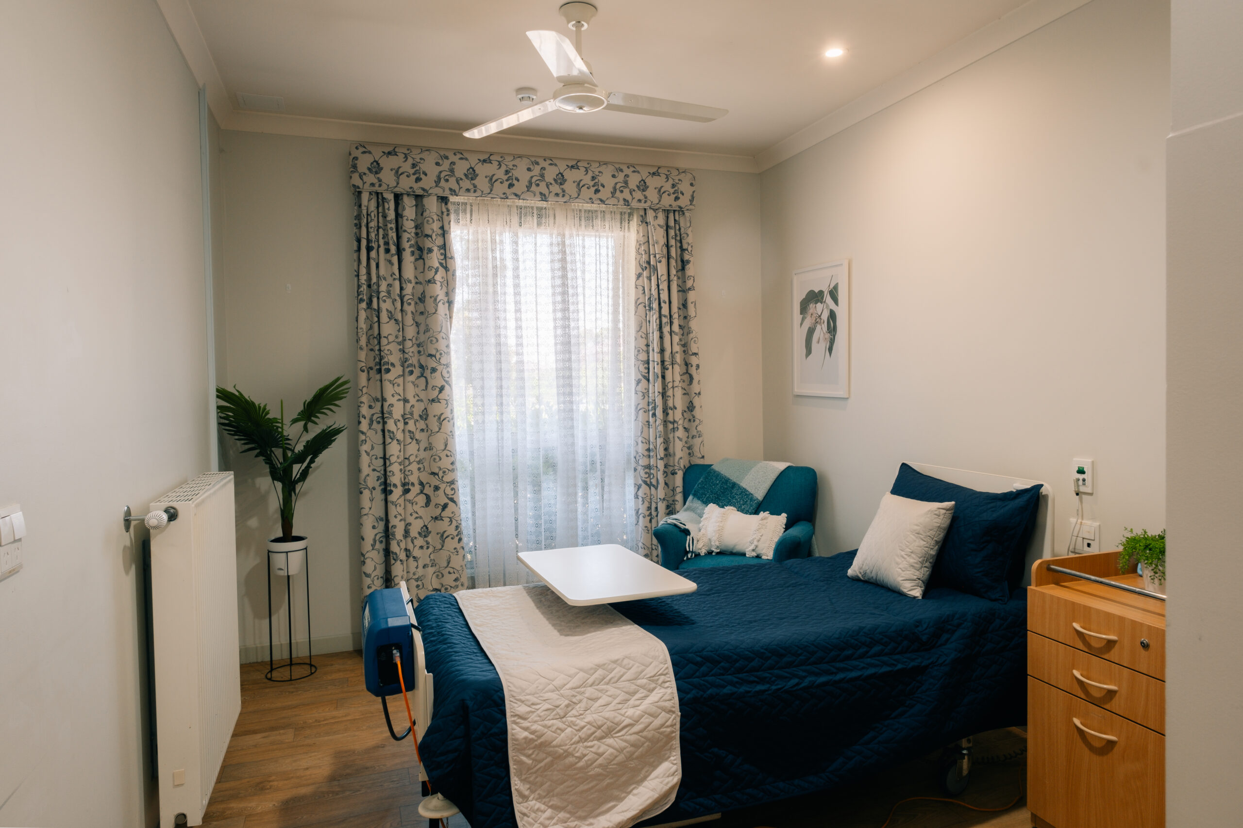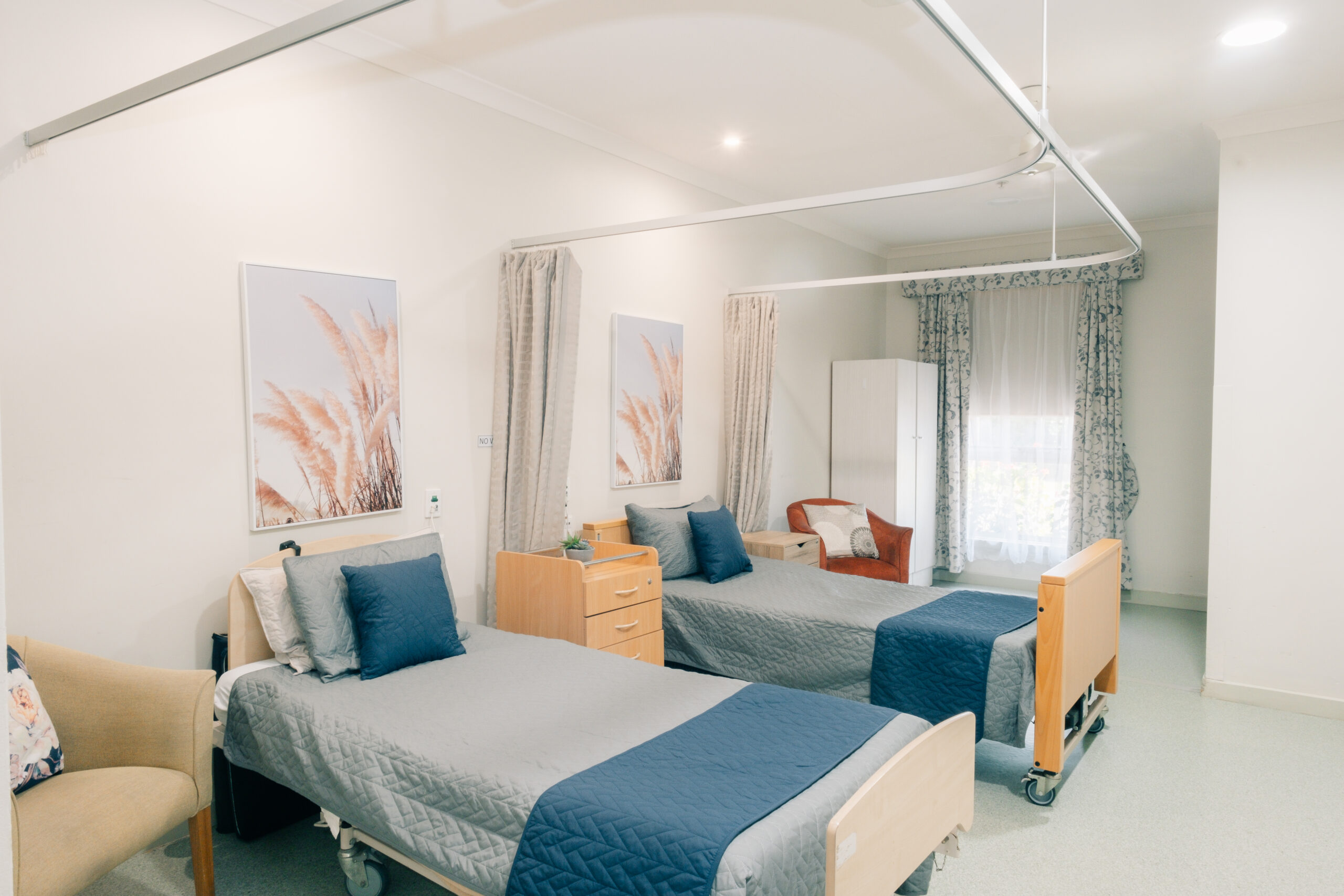 Economy Suites are shared rooms with their own ensuite. These room are located in various areas throughout the facility, with their windows either facing the side gardens or courtyard. These rooms are also located near the dining room and visitors outside area, providing plenty of opportunities to engage and socialise with fellow residents and staff. These rooms have either carpet or vinyl floor and are least 22.8msq.